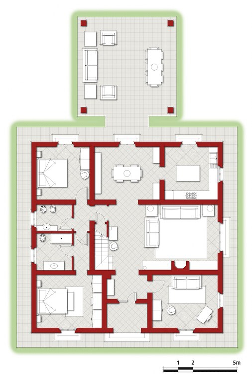 The house was built with traditional materials, but with up-to-date technology that guarantees waterproofing of foundations, high thermal and acoustic insulation and high structural integrity. There is an air conditioning system with inverter equipment, a satellite TV system, a set-up for a photovoltaic integrative system and an outdoor irrigation system.