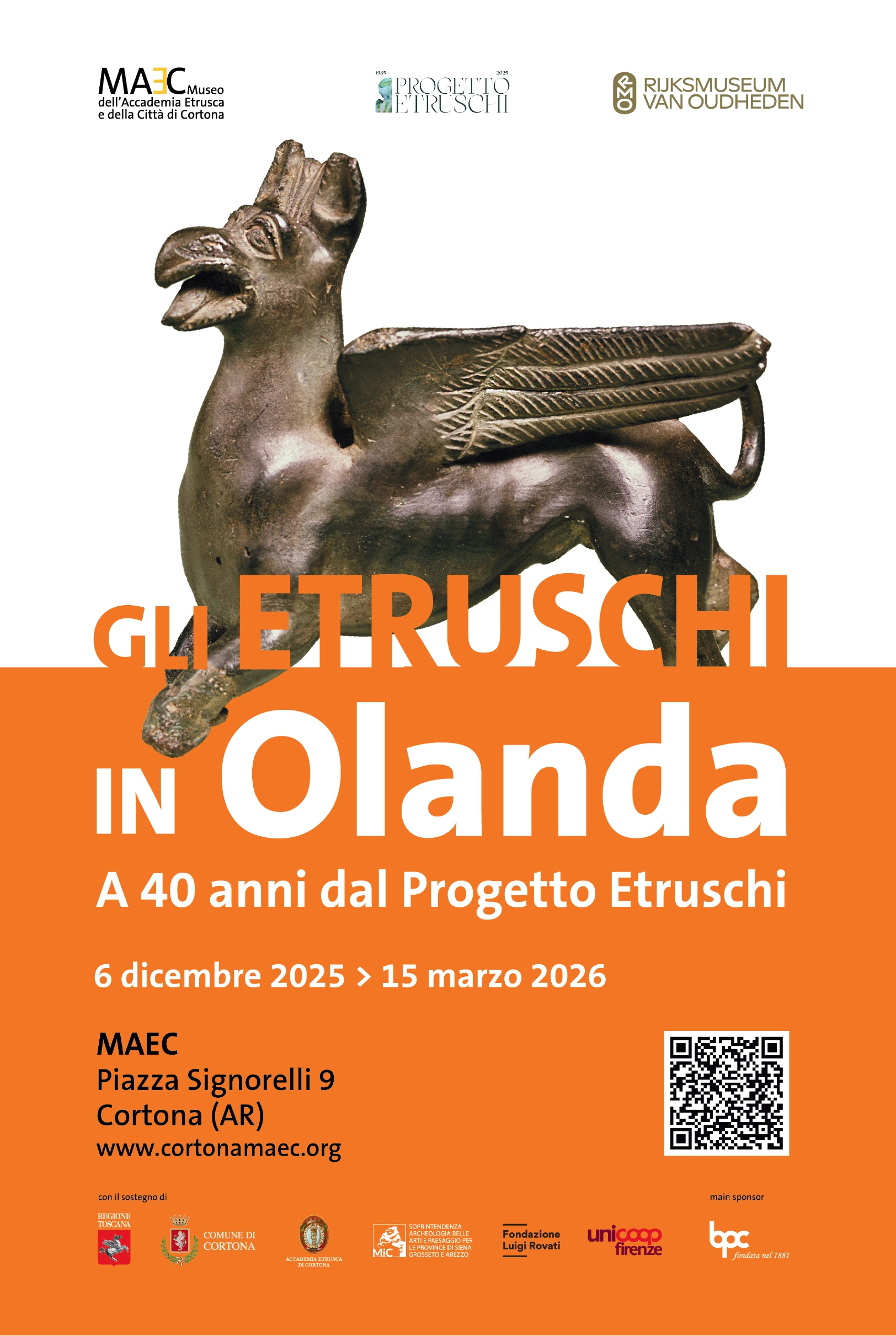 The exhibition project, promoted by the Municipality of Cortona and the Etruscan Academy, in collaboration with the Rijksmuseum van Oudheden in Leida, marks a new chapter in the enhancement of the archeological heritage and in the memory of the "Year of the Etruscans" of 1985, a key moment in the cultural history of Tuscany and Italy, when archeology: from knowledge for a few began a path of greater public sharing. Within the framework of the celebrations of the Etruscan Project of the Tuscany Region of 1985, the return to Cortona of part of the Corazzi Collection, which migrated in the nineteenth century to Holland practically 200 years ago (1826) and consisted of exceptional Etruscan bronzes, including the famous child with the goose and the griffin, symbol of the exhibition, is an opportunity to reflect on the importance of the international connections that were fundamental in the history of the Cortonese Academy, which will be three hundred years old in 2027, and that the MAEC, since its birth in 2005, has intended to continue.