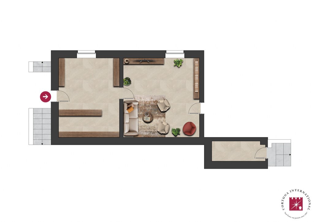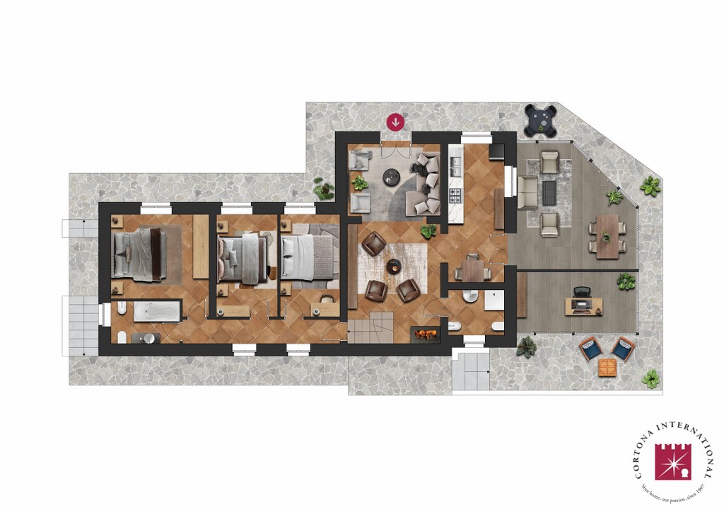 The property is located in an elevated position but it is certainly not isolated and within 5 minutes drive you can reach the small town of Montecchio and Cortona and Castiglion Fiorentino are within 15 minutes drive. Easy connections via train to Arezzo, Florence and Rome.