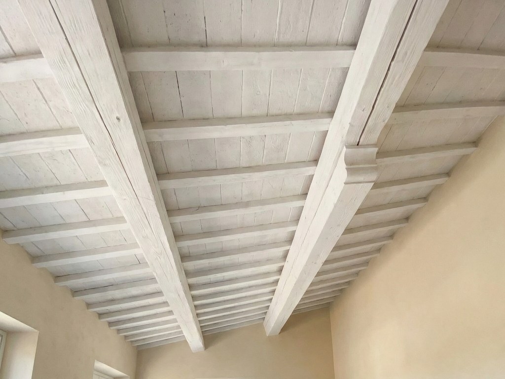 A generous entrance hall. To the right, a storage/garage/bicycle room. From here, access to rooms that originally served as village washrooms, now featuring two beautiful valley-facing windows and ceilings with exposed beams and small vaulted details.