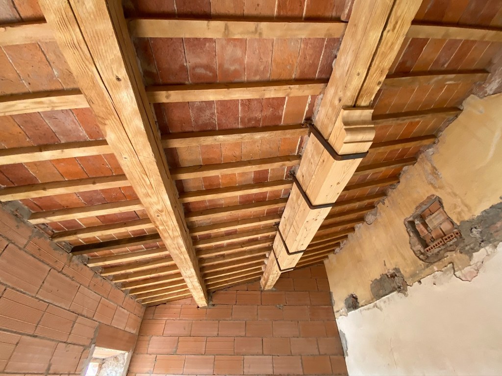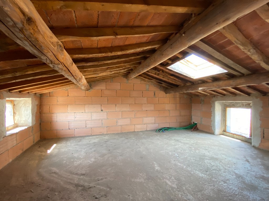 The house is currently in shell condition. Major structural works have already been completed, including a new roof, insulation, reinforced floors, and existing shutters. The remaining works include systems installation, windows, doors, and interior finishes.