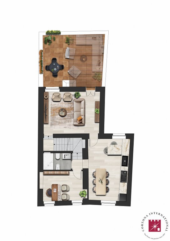 A truly distinctive level, with a bright living room opening onto the terrace, a spacious eat-in kitchen, a study, and a bathroom with shower.